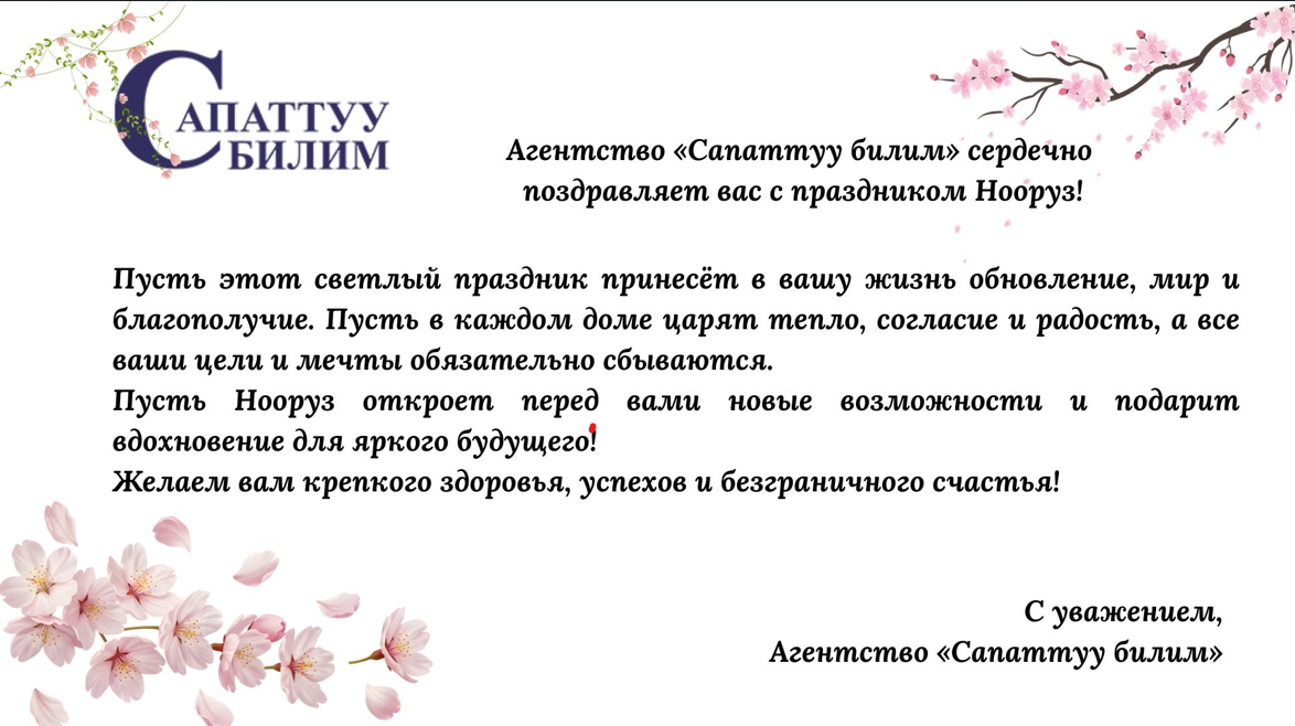 Агентство «Сапаттуу билим» сердечно поздравляет вас с праздником Нооруз! Пусть этот светлый праздник принесёт в вашу жизнь обновление, мир и благополучие. Пусть в каждом доме царят тепло, согласие и радость,…